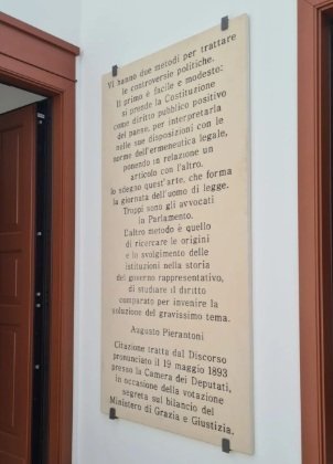 In questa frase, citata da Augusto Pierantoni durante il discorso pronunciato il 19 maggio 1893 presso la Camera dei Deputati, il senatore mette in luce una questione fondamentale: come si studia il diritto? E come si applica alla risoluzione delle controversie politiche? Un possibile approccio si può definire prettamente tecnico, ovvero incapace di interrogarsi sul contesto. Un fare “facile e modesto” da cui Pierantoni prese le distanze, prediligendo un approccio storico-comparativo che come un Giano bifronte – con uno sguardo al passato e uno al futuro – studia la storia delle istituzioni e la loro evoluzione, comparandole. È questa la via possibile per comprendere il senso profondo della norma, superando l’interpretazione puramente giuridica: le questioni istituzionali necessitano di una visione ampia, colta, trasversale e flessibile capace di rendere il decisore più consapevole, critico e dinamico. Oggi questa frase campeggia sul piano alto di Palazzo De Sanctis, dove una lastra commemorativa restituisce le parole di Augusto Pierantoni ma soprattutto una preziosa riflessione sul significato più autentico del diritto.